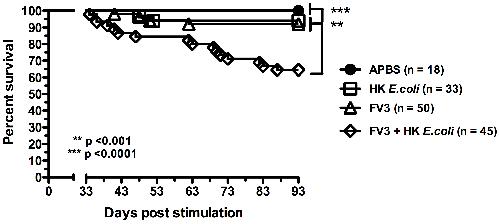 Kaplan-Meier curves represent outbred individual animals from three different experiments (35 total animals) that were infected with 1×106 PFU of FV3, subjected to a peritoneal lavage at 30 dpi, injected with heat-killed bacteria and subjected to another peritoneal lavage at 35 dpi, then monitored daily for signs of FV3 infection and death for 60 days (FV3+HK E. coli). Control animals included a group of 18 uninfected animals injected with saline vehicle (APBS), a group of 33 animals shame-infected with APBS that underwent peritoneal lavages and bacterial stimulation (HK E. coli), and a group of 40 animals infected with 1×106 FV3 (FV3). Statistical analysis was performed using the log-rank test (Mantel Cox) of a GraphPad Prism version 6.00 for Windows, La Jolla California USA, (URL: www.graphpad.com). The result are as follows: APBS vs HK E. coli, P<0.1; APBS vs FV3, P<0.1; APBS vs FV3+HK E coli, P<0.001; HK E. coli P vs FV3+HK E. coli, P<0.001.