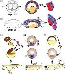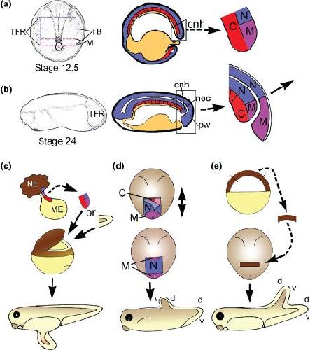 Figure 3. The NMC model for tailbud induction and tail inducing assays. (a) dorsal view of Stage 12.5 Xenopus embryo to show approximate location of the tailbud (TB) and tail forming region (TFR), cross-sectional drawing of same stage through the midline, anterior to left, showing the germ layers and location of the chordoneural hinge (cnh) at the dorsal blastopore lip (boxed). The location of C, N and M regions in the cnh are indicated. B) side view of Stage 24 embryo with dotted line outlining approximate limits of the TFR, cross section through midline to show germ layers (endoderm = yellow, mesoderm = red, and ectoderm = blue), tailbud (boxed), cnh and posterior wall (pw) and the location of the neurenteric canal (nec). Close up of box shows the location of N, M, and C in the tailbud following neurulation, as determined in Tucker and Slack.[29] (c) Grafts of the hinge region of exogastrulae, which contain unfolded NMC regions, or tailbuds, can induce formation of secondary tails if placed inside the blastopore cavity of a blastula stage embryo (einsteck graft).[29] NE, neuroectoderm and ME, mesendoderm. (d) 180° rotations of the neural plate at Stage 13 result in the formation of two new N/M boundaries. The posterior one lies over C and is induced to form a secondary tail in the normal location, the original N/M boundary has been exposed to C and so develops into a tail with reversed dorsal (d) ventral (v) polarity and the most anterior one does not form a tail, as it has not received a C signal. (e) Tailbud inducing activity assay, animal caps expressing test genes are removed at Stages 9–10 and trimmed into 100 × 600 μM rectangles before inserting into the neural plate of a host Stage 13 embryo.[27] Ectopic tails may be formed from the graft if they contain tailbud-like activity. In this case, the dorsal ventral polarity seems to come from the host. Germ layers in A and B are coloured as standard: Blue for ectoderm, red for mesoderm and yellow for endoderm. The M region is mesodermal in fate but ectodermal in origin and is therefore coloured purple. Data from Tucker and Slack, and Beck and Slack.[27, 29]