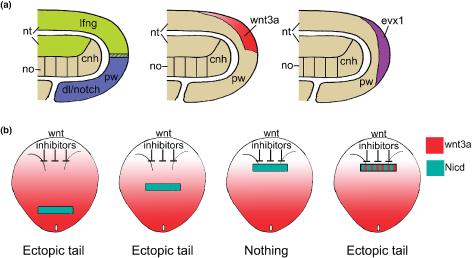 Figure 4. A proposed developmental pathway for outgrowth of the tailbud. (a) Drawings of cross sections through a Stage 31 Xenopus tailbud showing the location of the cnh, pw, and expression of five genes. Lfng (lime green) in the dorsal half of the tailbud and dll1/notch (blue) in the posterior wall suggests that notch signaling (hatched blue/green) could be active in the tail tip. Wnt3a (red) is present in a posterior to anterior gradient in the dorsal neural tube and evx1 (purple) in the tailbud tip. (b) Activating notch signaling in a graft in the neural plate of the trunk or anterior TFR results in an ectopic tail containing neural tube from the graft and fin from the host, and with tailbud markers expressed at the tip. If placed too far anterior, the graft fails to make a tail and is incorporated into the host neural tube. If wnt3a is added, anterior grafts also form tails, suggesting Wnt inhibition in anterior neural plate regions prevents notch from inducing tail outgrowth. Data from Beck and Slack.[27]