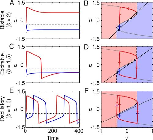 FIGURE 2:. Different types of dynamics from the FHN model. (A, C, E) Time course; (B, D, F) phase plots. (A, B) Bistability. For b = 2, the system is bistable, with two stable steady states (B, filled circles) and one saddle point (B, open circle). For the value of v(t = 0) assumed here (v(t = 0) = –0.3), trajectories beginning above a threshold value of u (A, dashed line) go to the high-u stable steady state, whereas those beginning below the threshold go to the low-u stable steady state. In the phase plane, a separatrix (dashed curve) divides the starting points that approach the high-u stable steady state (pink area) from those that go to the low-u steady state. (C, D) Excitability. For b = 1.5, there is a single stable steady state plus a saddle point and an unstable steady state. Trajectories beginning above the threshold (C) or the separatrix (D) yield a pulse of u and circle the unstable steady state before settling down to a low steady-state value of u. Those beginning below the threshold do not yield a pulse of high u. (E, F) Oscillations. For b = 1.0, the single steady state is unstable. From all initial conditions (except starting right on the unstable steady state), the trajectories approach the same stable limit cycle, although from above the threshold, they go first to the upper limb of the u-nullcline, and below the threshold, they go first to the lower limb. A, C, and E are time courses; B, D, and F are phase plots. In each case, a = 0.1, ε = 0.01, v(t = 0) = −0.3, and u(t = 0) = −0.25 (red trajectories) or −0.35 (blue trajectories). |