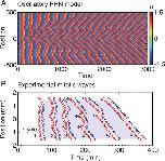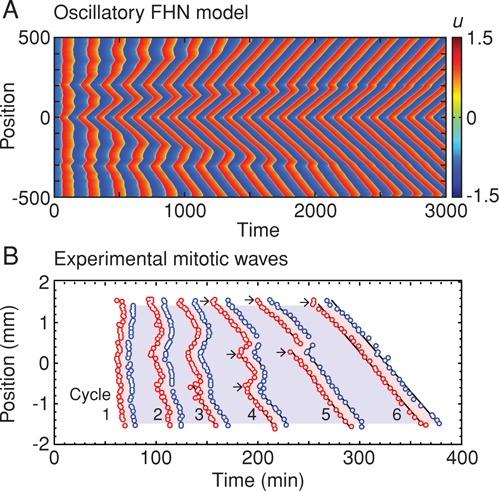 FIGURE 5:. Trigger waves tend to self-organize. (A) Self-organizing trigger waves in an oscillatory FHN model with the model's parameters assumed to be inhomogeneous in space. A single focus of oscillations eventually dominates the whole system. (B) Self-organizing mitotic waves in Xenopus egg extracts in Teflon tubes. The red circles mean that a reporter nucleus at that position entered mitosis at that time. The blue circles denote mitotic exit. In cycle 1, there is no obvious relationship between position and time of mitotic entry or exit, but by cycle 6, a wave of mitosis starting near the top of the tube dominates the whole system. The arrows denote positions from which waves apparently originate. (Adapted from Chang and Ferrell, 2013.) |