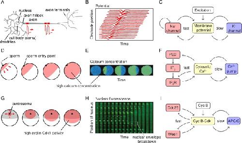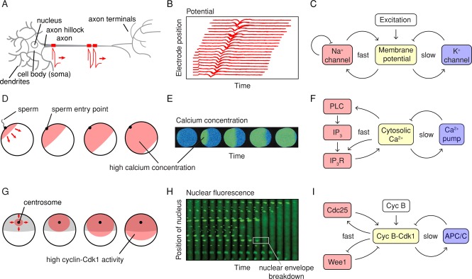 FIGURE 1:. Examples of biological trigger waves. (A–C) Action potentials. (A) Action potentials are generated at the axon hillock and propagate distally down the axon. (B) Recordings of an action potential traveling down an axon, measured by an array of extracellular electrodes. The inward flux of Na+ during an action potential registers as a negative deflection of the potential registered by the extracellular electrodes. (Adapted from Bakkum et al., 2013.) (C) Schematic view of the circuit that generates the action potential. (D–F) Calcium waves in fertilized eggs. (D) Calcium waves are generated at the sperm entry point and spread across the egg. (E) Calcium concentrations as a function of time in a fertilized oocyte from the milky ribbon worm, Cerebratulus lacteus, as measured by ratiometric imaging after calcium green loading. (Taken from Stricker, 1999.) (F) Schematic view of the circuit that generates calcium waves. (G–I) Mitotic waves in Xenopus eggs. (G) About 1 h after fertilization and the postfertilization calcium wave, a wave of Cdk1 activation spreads from near the centrosome to the cortex of the cell. (H) Waves of mitosis in Xenopus egg extracts. Thin Teflon tubes were filled with cycling Xenopus egg extracts together with sperm chromatin and a nuclear localization signal–green fluorescent protein marker. Waves of nuclear envelope breakdown spread from the fastest regions of the cytoplasm, near the middle of this section of the tube, outward. (Taken from Chang and Ferrell, 2013.) (I) Schematic view of the circuit that generates waves of cyclin B-Cdk1 activation. |