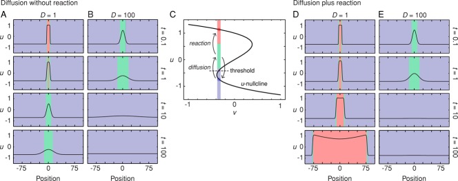 FIGURE 4:. Diffusion can push the system across a threshold. (A, B) Diffusive spreading of a high-u state in the absence of reaction for two different diffusion coefficients. The values of u as a function of position and time are depicted both as curves and in a simplified red-green-blue heat map representation. Increasing the diffusion coefficient allows some regions within the low-u region to attain moderately high (green) levels of u more quickly, but for a shorter duration. (C) Phase plot for one point in space that is initially in the low-u region. Diffusion moves the value of u across the threshold into the green region, but in the absence of reaction, eventually returns it to the blue region. If the FHN reactions are fast enough, they can capture the suprathreshold trajectory and convert this point in space to a high-u (red) state. (D, E) Diffusion plus reaction allows self-regenerating trigger waves to propagate outward (D) unless the diffusion coefficient is too high (E). |