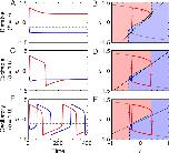 FIGURE 2:. Different types of dynamics from the FHN model. (A, C, E) Time course; (B, D, F) phase plots. (A, B) Bistability. For b = 2, the system is bistable, with two stable steady states (B, filled circles) and one saddle point (B, open circle). For the value of v(t = 0) assumed here (v(t = 0) = â0.3), trajectories beginning above a threshold value of u (A, dashed line) go to the high-u stable steady state, whereas those beginning below the threshold go to the low-u stable steady state. In the phase plane, a separatrix (dashed curve) divides the starting points that approach the high-u stable steady state (pink area) from those that go to the low-u steady state. (C, D) Excitability. For b = 1.5, there is a single stable steady state plus a saddle point and an unstable steady state. Trajectories beginning above the threshold (C) or the separatrix (D) yield a pulse of u and circle the unstable steady state before settling down to a low steady-state value of u. Those beginning below the threshold do not yield a pulse of high u. (E, F) Oscillations. For b = 1.0, the single steady state is unstable. From all initial conditions (except starting right on the unstable steady state), the trajectories approach the same stable limit cycle, although from above the threshold, they go first to the upper limb of the u-nullcline, and below the threshold, they go first to the lower limb. A, C, and E are time courses; B, D, and F are phase plots. In each case, a = 0.1, ε = 0.01, v(t = 0) = â0.3, and u(t = 0) = â0.25 (red trajectories) or â0.35 (blue trajectories). |