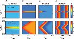 FIGURE 3:. Three types of trigger waves from coupling the FHN reactions to diffusion. The system is assumed to have one spatial dimension (represented on the y-axis); it is essentially a long, thin tube. The values of u as a function of time and position are represented by a heat map color scale. In all cases we assumed that the system has a high initial value of u in the middle of the tube over a width of 40 units (u(t = 0) = 1) and a low initial value of u elsewhere (u(t = 0) = –0.6). The initial value for v is the same everywhere (v(t = 0) = –0.3). For the oscillatory case, we also assumed that the frequency of the oscillations is higher in the middle of the tube (b = 0.5) than in the rest of the tube (b = 1), acting as a pacemaker for the whole system. In the top panels there is no diffusive coupling (D = 0), while in the bottom panels diffusion is included (D = 1). The FHN parameters are the same as those shown in Figure 2. |