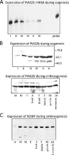 FIGURE 2. Expression of PIAS2b and XCtBP during early Xenopus development. A, RNase protection analysis of PIAS2b mRNA. Total RNA from 10 oocytes at the indicated Dumont stage (85) was hybridized with an antisense 32P-labeled RNA probe. The sample was then digested with RNase One, analyzed on a denaturing polyacrylamide gel, and detected by autoradiography. B, Western blot analysis of PIAS2b. Protein extracts (2 oocyte or 1.5 embryo equivalents) were prepared from developmentally staged oocytes and embryos (86) as indicated, including progesterone-matured oocytes (M) and unfertilized eggs (E). The position of molecular weight standards (in kilodaltons) is indicated. C, Western blot analysis of XCtBP. |