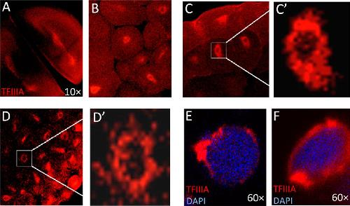 FIGURE 6. Localization of TFIIIA to the nuclear periphery. TFIIIA antibody directly conjugated to Alexa Fluor 568 was used to immunohistochemically stain embryos at the indicated stage of development. A, two-cell embryo. B, midblastula stage (stage 8) embryo. C, late blastula stage (stage 9) embryo. D, midneurula stage (stage 19) embryo. E, nucleus of a midneurula embryo injected with Gam1 mRNA counterstained with DAPI. F, nucleus of a midneurula embryo injected with water and counterstained with DAPI. Images were collected at ×20 magnification unless indicated otherwise. C' and D' are magnifications of the indicated regions of the images in the corresponding panels. |