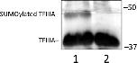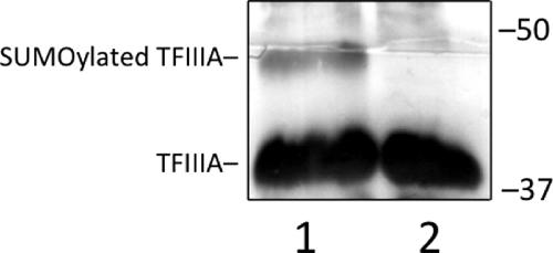 FIGURE 7. SUMOylation of TFIIIA. In vitro SUMOylation of TFIIIA was tested using purified E1 and E2 enzymes. Products of the reactions were analyzed by a Western blot analysis developed with TFIIIA antibody. Lane 1, TFIIIA with SUMO1 and E1 and E2 enzymes; lane 2, TFIIIA alone. The positions of molecular weight markers (in kilodaltons) are indicated. |