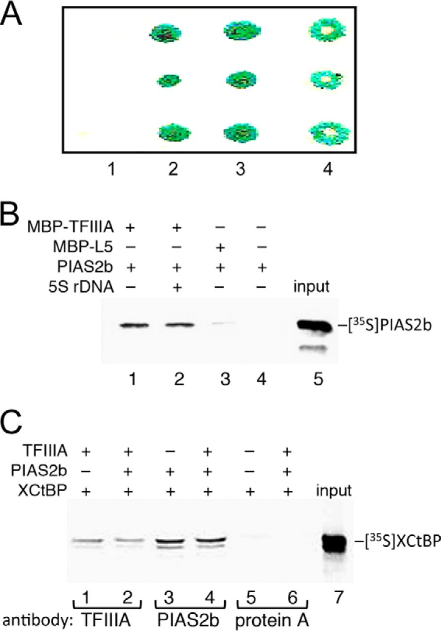 FIGURE 1. TFIIIA interacts with PIAS2b and XCtBP. A, colony lift filter assay used to measure interactions between PIAS2b and TFIIIA in a yeast two-hybrid system. Triplicate assays are presented in each column, with the following bait/prey combinations: lane 1, lamC/T antigen (negative control); lane 2, TFIIIA (fingers 1–3)/PIAS2b; lane 3, TFIIIA (fingers 1–4)/PIAS2b; lane 4, p53/PIAS2b. B, MBP-TFIIIA or MBP-L5 (negative control) fusion protein was incubated with reticulocyte lysate containing 35S-labeled PIAS2b. The fusion protein was recovered by binding to amylose resin. Precipitated samples were analyzed by SDS-PAGE followed by autoradiography. C, reticulocyte lysate containing 35S-labeled XCtBP was incubated with either TFIIIA or PIAS2b alone or with both proteins together. Complexes were collected by immunoprecipitation using either anti-TFIIIA (lanes 1 and 2) or anti-PIAS2b (lanes 3 and 4) antibody adsorbed to protein A-Sepharose. Control assays used unmodified protein A-Sepharose. Precipitated samples were analyzed by SDS-PAGE followed by autoradiography. |