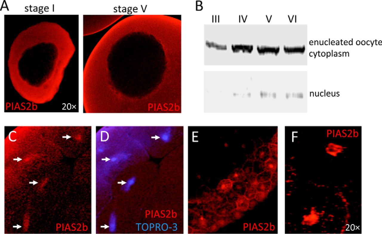 FIGURE 3. Subcellular localization of PIAS2b during early development. Staged albino oocytes and embryos were stained using PIAS2b primary antibody and secondary antibody conjugated to Alexa Fluor 568. A, PIAS2b is exclusively cytoplasmic at all stages of oogenesis. B, protein extract prepared from nuclei and enucleated oocytes (1.5 oocyte equivalents per stage) was analyzed by Western blotting using PIAS2b antiserum. Oocyte stages are indicated above each lane. Top panel, a blot of extract from enucleated oocytes. Bottom panel, extract prepared from isolated nuclei. Also shown is immunohistochemical staining of embryos at mid-blastula (C and D) and early gastrula (E and F) stages for PIAS2b. D, overlay of PIAS2b and TOPRO-3 nuclear staining of the midblastula embryo shown in C. Arrows point to individual nuclei. Images were collected at Ã10 magnification unless indicated otherwise. |