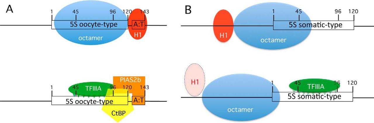 FIGURE 8. Model for the repression of the oocyte-type 5 S rRNA genes following the midblastula transition. A, repression of the oocyte-type genes is largely due to histone H1-dependent positioning of a nucleosome over the binding site for TFIIIA (nucleotides 45–96). The A:T-rich sequence flanking the 3′ end of the gene, which is the binding site for the linker histone, is required for repression. In addition, ∼1% of the oocyte-type genes are bound by TFIIIA, which can interact with PIAS2b and the CtBP corepressor complex. This complex may be stabilized by an interaction between the SAP domain of PIAS2b and the A:T-rich sequence that immediately flanks the 3′ end of the oocyte-type genes. B, the somatic-type genes are flanked by G:C-rich sequences, providing no contact site for PIAS2b. Histone octamers are weakly positioned on the somatic-type gene, and the binding site for TFIIIA is exposed. Binding of the transcription factor is sufficient to reposition the octamer that possibly leads to dissociation of the H1 linker histone (18). |