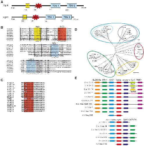 Fig. 1. Protein sequence analysis, structural comparison, family relationships and synteny analysis of Vgll4 and Vgll4l. (A) Protein structure of Vgll4 and Vgll4l. NES, nuclear export signal; NCS, novel conserved sequence;TDU, TONDU domain. (B) Protein sequence alignment comparing Xenopus laevis (Xl) Vgll4 and Vgll4l with Xenopus tropicalis (Xt), human (Hs), mouse (Mm), and zebrafish (Dr). Conserved Amino acids are shown in grey. (C) A wide comparison of the NCS region between different species. Chicken (Gg), Drosophila melanogaster (Dm), Taeniopygia guttata (Tg), Bos taurus (Bt), Rattus norvegicus (Rn), Macaca mulatta (Mama), Pongo abelii (Pa), Salmo salar (Ss), Pan troglodytes (Pt). (D) Unrooted phylogenetic tree showing the evolutionary relationship among different Vgll proteins. The tree was based on amino acid sequence alignment (see Experimental Procedures for details). (E) Analysis of conserved syntenic regions containing Vgll4 and Vgll4l loci in Xenopus tropicalis (X.t.), zebrafish (Danio rerio, D.r.), puffer fish (Takifugu rubripes, T.r.), stickleback (Gasterosteus aculeatus, G.a.), medaka (Oryzias latipes, O.l.), tilapia (Oreochromis niloticus, O.n.), cod (Gadus morhua, G. m.), human (H.s.), mouse (M.m.), and chicken (G.g.) genomes. Genes are represented as boxes and arrows indicate the orientation of the transcription unit. Boxes with the same color indicate orthologue genes. The genomic regions representations are not to scale to avoid complexity. |