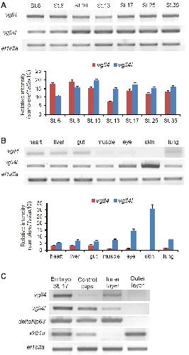 Fig. 2. RT-PCR analysis of vgll4 gene expression in embryos and adult tissues. RT-PCR was performed on total RNA extracted from embryos at different embryonic stages, adult tissues and internal and external layers of animal caps. ef1alfa was used as loading control. (A) Temporal expression of vgll4 and vgll4l throughout development. (B) Analysis of vgll4 and vgll4l expression in adult tissues. (A,B) Quantifications of gel are shown; the results are expressed as Relative Intensity (sample/ef1alfa X 10). (C) vgll4 and vgll4l expression in isolated layers of the animal cap ectoderm. |