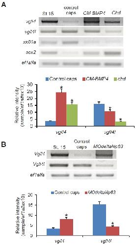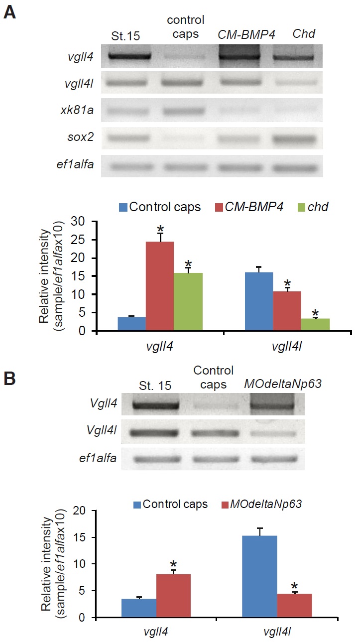 Fig. 6. Regulation of vgll4 and vgll4l expression in the ectoderm. One-cell stage embryos were injected with CM-BMP4 or chd mRNA (A) or MOdeltaNp63 (B). Stage 15- control embryos were not injected. At stage 9, animal caps were dissected. Total RNA was isolated from stage 15 embryos and treated and control caps and the expression of vgll4 and vgll4l was analyzed by RT-PCR. ef1alfa was used as loading control. Quantification of gels is shown; the results are expressed as Relative Intensity (sample/ef1alfaX10). Differences were considered statistically significant at P < 0.001(*). |