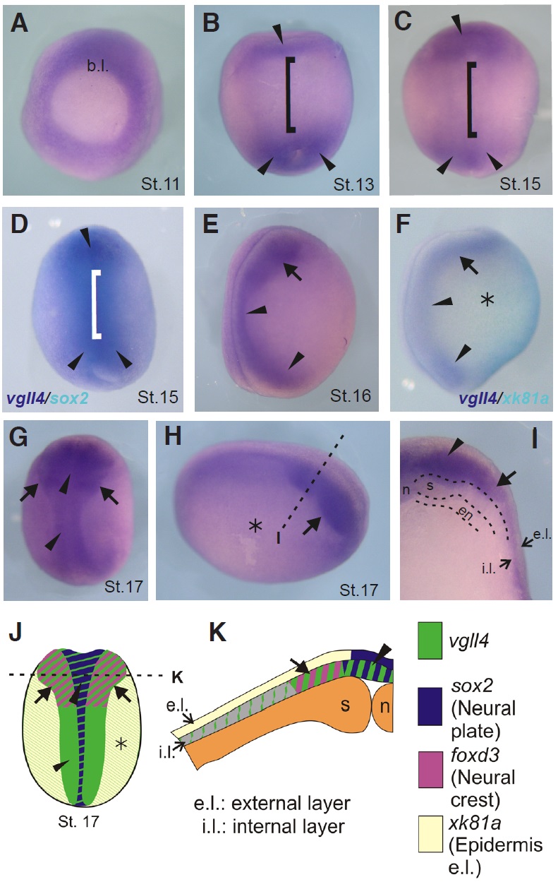 Fig. 4. Spatio-temporal expression pattern of vgll4 during early development by in situ hybridization. (A) Vegetative view. (B-D, G) Dorsal view, anterior to the top. (E, F) Lateral view, dorsal to the left, anterior to the top. (H) Lateral view, dorsal to the top, anterior to the right. (I) Transversal section. Black dashed line in H indicates the position of the cut made to give cross-section in I. (D) Double in situ hybridization for vgll4 (purple) and sox2 (turquoise). (F) Double in situ hybridization for vgll4 (purple) and xk81a (turquoise). (B-D) Arrowheads, anterior and posterior vgll4 expression in the neural plate. Brackets, lack of expression in the middle neural plate. (F, H) Asterisk, weak vgll4 expression in the prospective epidermis. Arrow, neural folds vgll4 expression. Arrowhead, neural plate expression. (J, K) Schematic diagrams summarizing the expression of vgll4l and neural plate (sox2), neural crest (foxd3) and epidermal (xk81a) markers. (J) Dorsal view. (K) Transversal section. References: b.l., blastopore lip. e.l., external layer. en, endoderm. i. l.: internal layer. n, notochord. s, somites. |