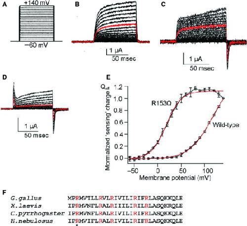 Figure 2. Measurement of Off “sensing” currents in newt VSP (Cp‐VSP) and its R153Q mutant. (A) A pulse protocol. Voltage was evoked ranging from −60 to +140 by 10‐mV increments. (B) Representative traces of an uninjected oocyte. (C, D) Representative traces of Off “sensing” currents of wild‐type (WT) Cp‐VSP and its R153Q mutant, respectively. Red trace indicates the current at +80 mV. Both On “sensing” and Off “sensing” currents were observed in R153Q mutants. (E) Qoff‐V curves from WT Cp‐VSP and its R153Q mutant. Red curves indicate fit by a Boltzmann equation. In WT data, plots were not saturated. The value of charges at 140 mV was used for standardization of Qoff‐V curves for WT. V1/2 of the R153Q mutant was 18.1 ± 1.5 mV, n = 4. Error bars are mean ± SD. Charge was standardized by the charge value of Qoff at repolarization from +140 mV step pulse. (F) Alignment of amino acid sequences of S4 segment among Cp‐VSP, Hn‐VSP, Xl‐VSP, and Gg‐VSP and the position of R153 is shown by asterisk. |