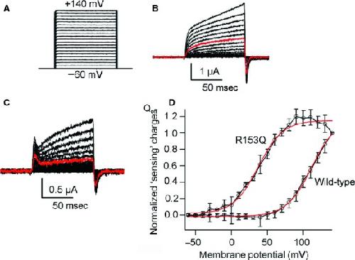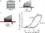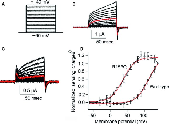 Figure 3. Off “sensing” currents in salamander VSP (Hn‐VSP) and its R153Q mutant. (A) A pulse protocol. Voltage was evoked ranging from −60 to +140 by 10‐mV increments. (B, C) Representative traces of Off “sensing” currents of wild‐type (WT) Hn‐VSP and its R153Q mutant, respectively. Red trace indicates the current at +80 mV. Both On “sensing” and Off “sensing” currents were observed in the R153Q mutant. (D) Qoff‐V curves from WT Hn‐VSP and its R153Q mutant. Red curves indicate plots fitted by Boltzmann equation. V1/2 of the R153Q mutant was 37.0 ± 2.6 mV, n = 4. |