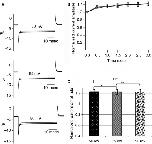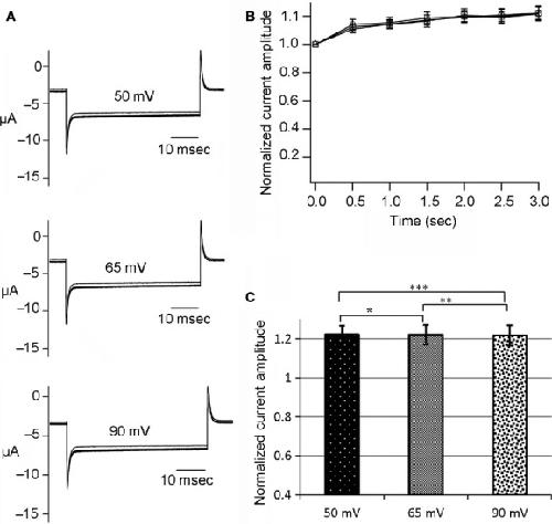 Figure 5. Measurements of phosphatase activity of salamander VSP (Hn‐VSP). (A) Phosphatase activity of Hn‐VSP recorded at 50, 65, and 90 mV. (B) Normalized current amplitudes plotted against time. Data in the plot are mean ± SEM, n = 4, 50 mV (circles), 65 mV (squares), and 90 mV (triangles). (C) Bar graphs for current amplitudes at 3 sec. Error bars are SEM, *P = 0.99, **P = 0.94, ***P = 0.95. |