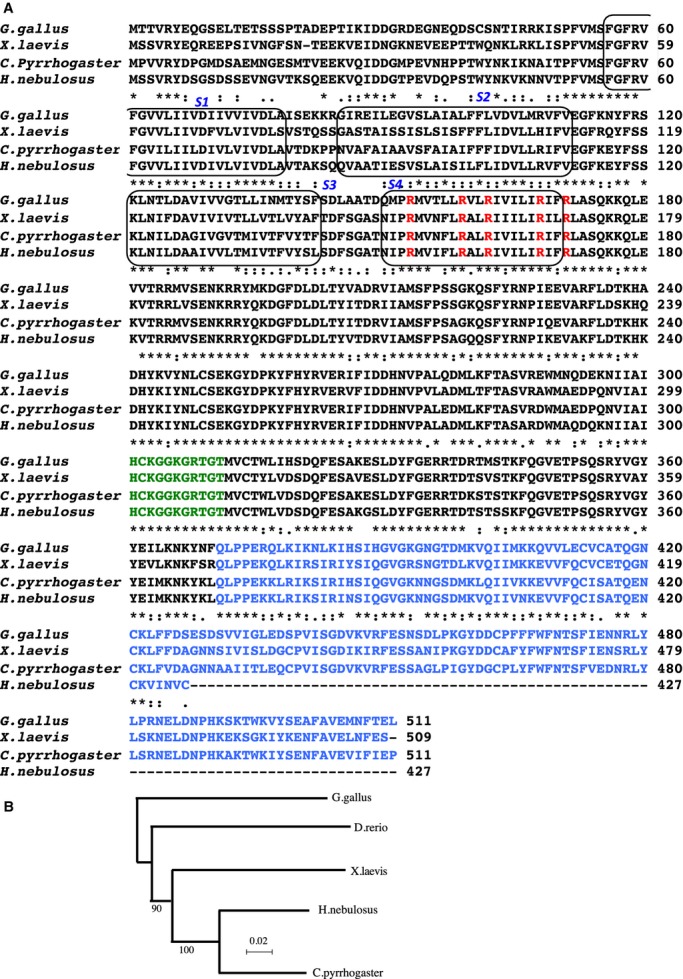 Figure 1. (A) Multiple amino acid alignments of newt (Cynops pyrrhogaster), salamander (Hynobius nebulosus), frog (Xenopus laevis), and chick (Gallus gallus) VSPs. The transmembrane segments (S1–S4) are surrounded by round squares. The conserved arginines in the S4 segment are shown in red. The conserved active site of the phosphatase domain is shown in green. The C2 domain is shown in blue. Note that a part of C2 domain is absent in salamander VSP. (B) Dendrogram of amino acid sequences of VSP orthologs. Bootstrap value is indicated. |
