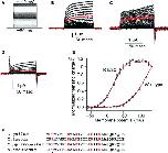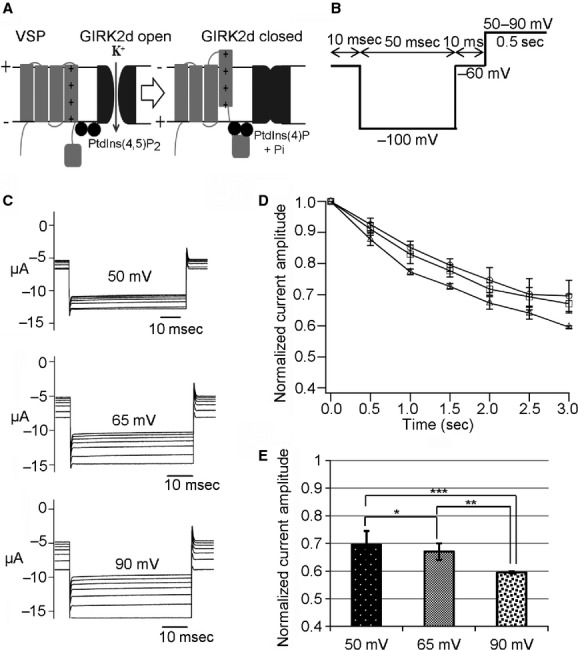 Figure 4. Measurements of phosphatase activity of newt VSP (Cp‐VSP). (A) Schematic representation of experimental GIRK2 read out of depolarization‐dependent VSP activity. PtdIns(4,5)P2 depletion leads to the closure of the GIRK2 ion channel. (B) A pulse protocol for measuring GIRK2 currents on newt and salamander VSPs. Interval voltages were set to 50, 65, and 90 mV. (C) Depolarization‐dependent phosphatase activity of Cp‐VSP recorded at 50, 65, and 90 mV. (D) The amplitudes of the inward GIRK2 currents were normalized to the value of the first current trace and plotted against time. Data in the plot are mean ± SEM, n = 6, 50 mV (circles), 65 mV (squares), and 90 mV (triangles). (E) Bar graph for the normalized current at 3 sec. Error bars are SEM, *P = 0.68, **P = 0.04, ***P = 0.02. |