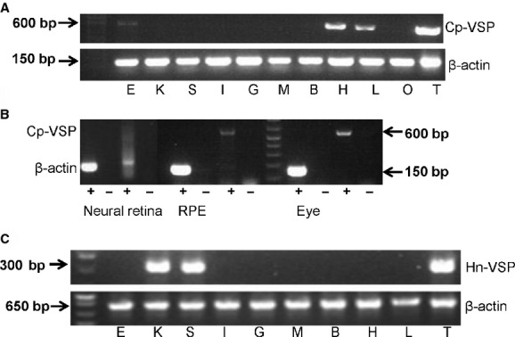 Figure 7. RTâPCR results of the gene expression pattern of CpâVSP and HnâVSP. (A) CpâVSP (upper panel). βâactin for the positive control (lower panel). E, eye; K, kidney; S, spleen; I, intestine; G, gut; M, muscle; B, brain; H, heart; L, lung; O, ovary; T, testis. (B) Expression of CpâVSP in eye and retinal pigment epithelium (RPE), but not in the neural retina (+ or â indicates PCR reaction with or without reverse transcriptase) (C) HnâVSP (upper panel). βâactin for the positive control (lower panel). E, eye; K, kidney; S, spleen; I, intestine; G, gut; M, muscle; B, brain; H, heart; L, lung; O, ovary; T, testis. Arrows indicate band size. |