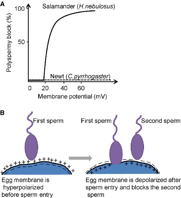 Figure 8. Positive‐going membrane potential controls sperm‐egg fusion in Hynobius nebulosus but not in Cynops pyrrhogaster. (A) A graphical representation of percent polyspermy block. When the eggs were clamped at membrane potentials >20 mV Hn‐sperms (curve) were prevented from fusing with the egg, whereas Cp‐sperms (dash line) were not (from Iwao and Jaffe 1989). (B) Cartoon showing the hypothesis of molecular mechanisms of polyspermy block, based on the ability of sperm to sense change in the egg membrane potential (adapted from Iwao and Jaffe 1989). After the first sperm is successfully fused with egg, the second sperm is prevented from fusion with the egg through VSP activities. In the second sperm, VSP, which could potentially be localized in sperm membrane, senses depolarized egg cell membrane through transient cell fusion and its phosphatase activity downregulates phosphoinositides which may be required for progression of cell fusion event (Ratzan et al. 2011). |