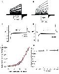 Figure 6. C2‐domain truncated Ci‐VSP and Cp‐VSP mutants lack phosphatase activity. (A, B) Sensing currents recording of C2‐domain truncation mutant of Ci‐VSP and Cp‐VSP, respectively. (C, D) Phosphatase activity of truncated mutant of Ci‐VSP and Cp‐VSP, respectively, measured at 65 mV. (E) Qoff‐V plots for truncated Ci‐VSP (squares) and Cp‐VSP (circles), n = 6 for both. (F) Normalized current amplitudes plotted against time, n = 4 for both Ci‐VSP (squares) and Cp‐VSP (circles). Data in the plots are mean ± SD. |