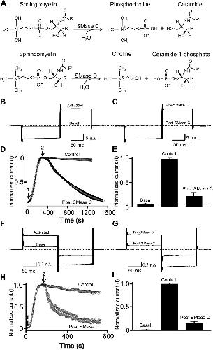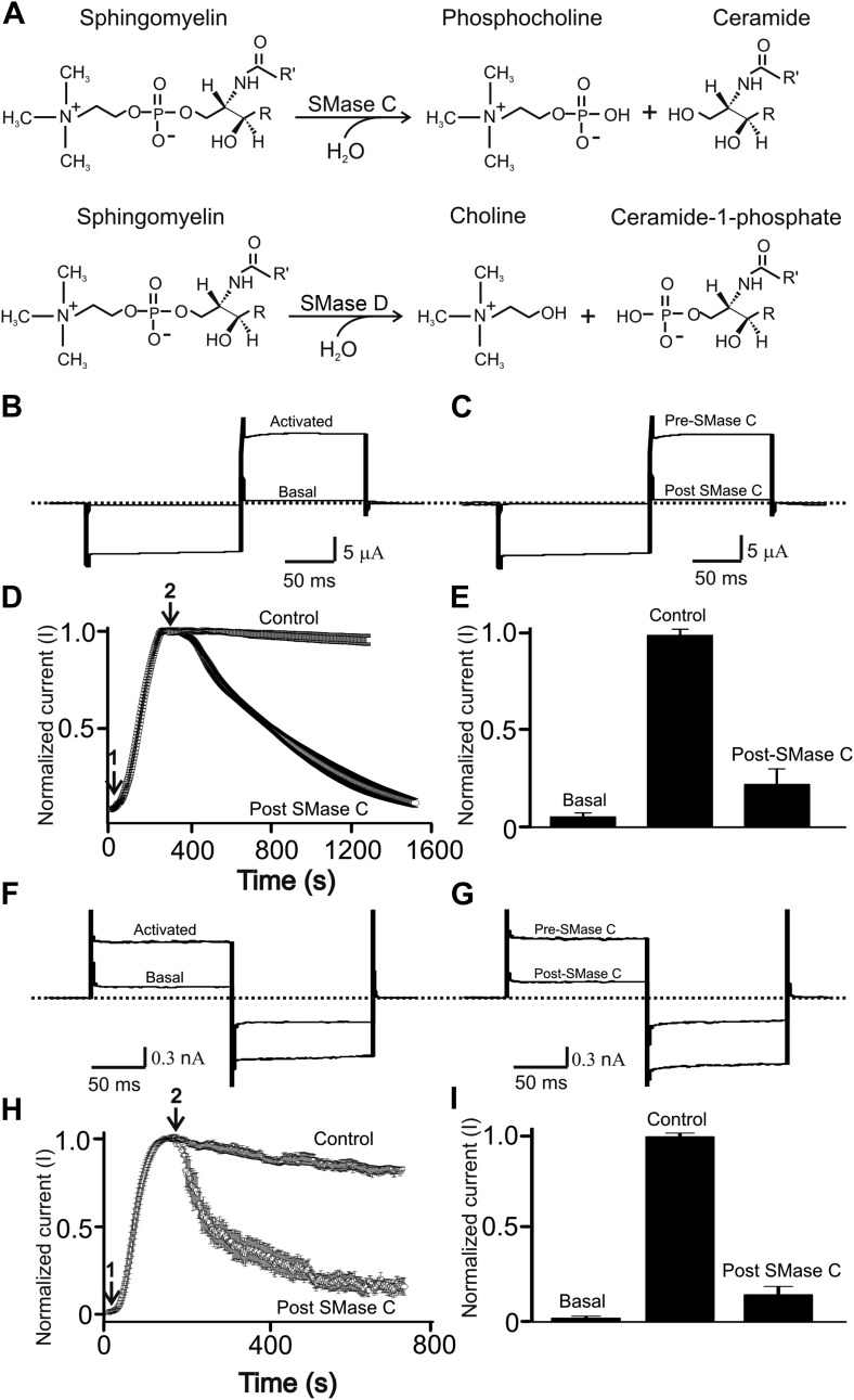 Figure 1. SMase C suppression of heretologously expressed and native CFTR currents.(A) Sphingomyelin hydrolysis reactions catalyzed by SMases C and D. (B) and (C) Currents of an oocyte injected with cRNA encoding CFTR before or after activation with 50 µM forskolin and 1 mM IBMX in the bath solution (B) and activated CFTR currents pre- or post-application of SMase C from S.aureus (SaSMase C: 0.4 ng/μl) (C), elicited by stepping membrane voltage from the −30 mV holding potential to −80 mV and then to 50 mV. (D) Time course of normalized CFTR currents at 50 mV where the arrows indicate addition of forskolin plus IBMX (arrow 1) or SaSMase C (arrow 2) (mean ± s.e.m, n = 6). (E) Normalized current amplitude before or after activation by forskolin plus IBMX and post-SMase C treatment (mean ± s.e.m, n = 6). (F) and (G) Native currents of a Calu-3 cell before or after activation with 50 µM forskolin and 1 mM IBMX in the bath solution (F) and activated CFTR currents before and after addition of SaSMase C (G), elicited by stepping membrane voltage from the 0 mV holding potential to −80 mV and then to 80 mV. (H) Time course of normalized CFTR currents at 80 mV where the arrows indicate addition of forskolin plus IBMX (arrow 1) or SaSMase C (0.5 ng/μl; arrow 2) (mean ± s.e.m, n = 7). (I) Normalized current amplitude before or after activation by forskolin plus IBMX and post-SMase C treatment (mean ± s.e.m, n = 7).DOI: