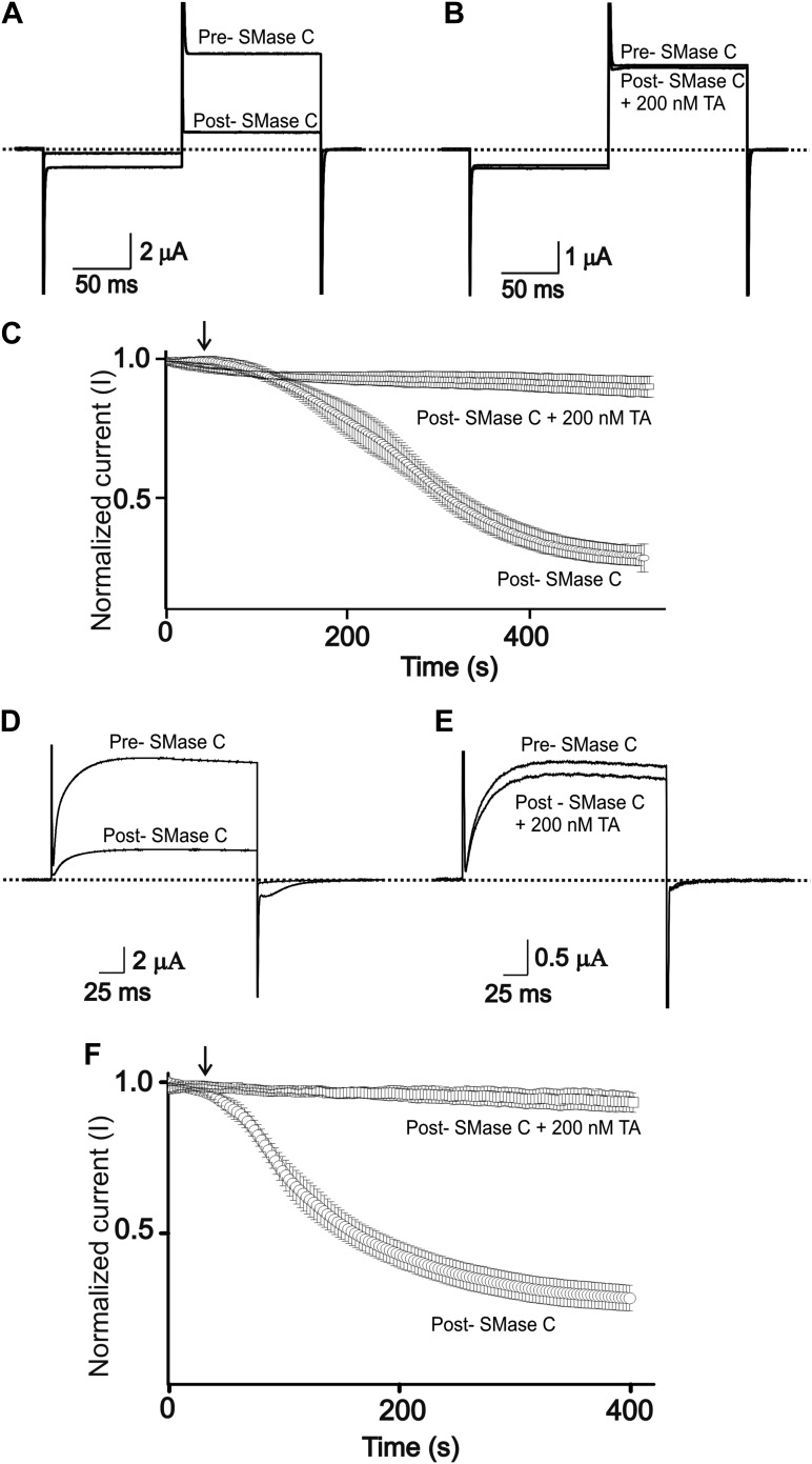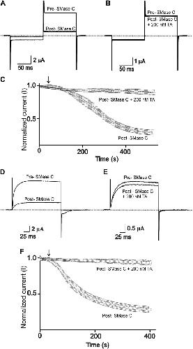 Figure 4. Tannic acid antagonizes suppression of CFTR and Kv1.3 currents by SMase C of B.anthracis (BaSMase C).(A) and (B) Currents of an oocyte injected with cRNA encoding CFTR, which was activated as in Figure 1, before (pre) and after (post) addition of BaSMase C (0.6 ng/μl) without (A) and with (B) 200 nM TA present. (C) Time course of normalized CFTR currents at 50 mV without or with 200 nM TA present in the bath; arrow indicates addition of BaSMase C (mean ± s.e.m, n = 10). (D) and (E) Currents of an oocyte injected with cRNA encoding Kv1.3 before (pre) and after (post) addition of BaSMase C without (D) and with (E) 200 nM TA, elicited by stepping membrane voltage from the −80 mV holding potential to 20 mV and then back to −80 mV. (F) Time course of normalized Kv1.3 currents at 20 mV without or with 200 nM TA in the bath; arrow indicates addition of BaSMase C (mean ± s.e.m, n = 4).DOI:
