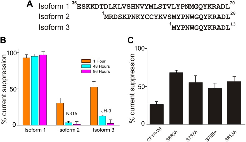Figure 2. Effects of isoforms and mutations on SaSMase C suppression of CFTR current.(A) N-terminal sequences of three SaSMase C isoforms. (B) Percentage of SaSMase C suppression of CFTR current by individual isoforms at 1, 48 and 96 hr after final purification of SMase C (mean ± s.e.m, n = 5), where the final concentration was 0.4 ng/µl for isoform 1 and 40 ng/µl for isoforms 2 and 3. (C) Percentage of SaSMase C suppression of wild-type and mutant CFTR currents activated by expressing cRNA encoding the PKA catalytic subunit (mean ± s.e.m, n = 7–10).DOI: