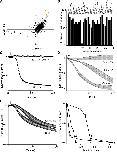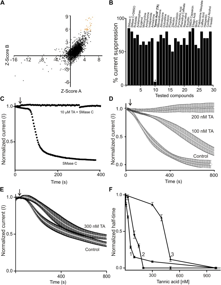 Figure 3. Tannic acid (TA) counteracts SaSMase C and SMase D suppression of CFTR current.(A) Correlation plot of Z scores (raw scores minus the mean of the population, divided by the standard deviations of individual compounds) of individual compounds tested in two repeated screens; 27 compounds with higher Z scores are colored orange. (B) Percentage SaSMase C suppression of CFTR currents in the presence of 27 tested compounds, each at 10 µM. (C) Time course of normalized CFTR currents at 50 mV without or with 10 µM tannic acid (TA) present in the bath; arrow indicates addition of SaSMase C (0.6 ng/µl). (D) and (E) Time courses of normalized CFTR currents at 50 mV without and with 100 or 200 nM (D) or 300 nM (E) tannic acid present in the bath; arrow indicates addition of SaSMase C (D) and SMase D (E) (mean ± s.e.m, n = 3–5). (F) Apparent activities of SaSMase C (1 and 2) or SMase D (0.6 ng/μl) (3) plotted against the concentration of tannic acid, where the activities are expressed as half-time of the time course of sphingomyelin hydrolysis (1) or CFTR inhibition (2 and 3), which were obtained by the Amplex red assay (1) or by electrophysiological recordings (2 and 3). The half-time values were normalized to the corresponding ones obtained in the presence of relevant enzymes and the absence of tannic acid.DOI: