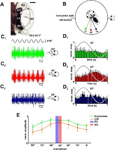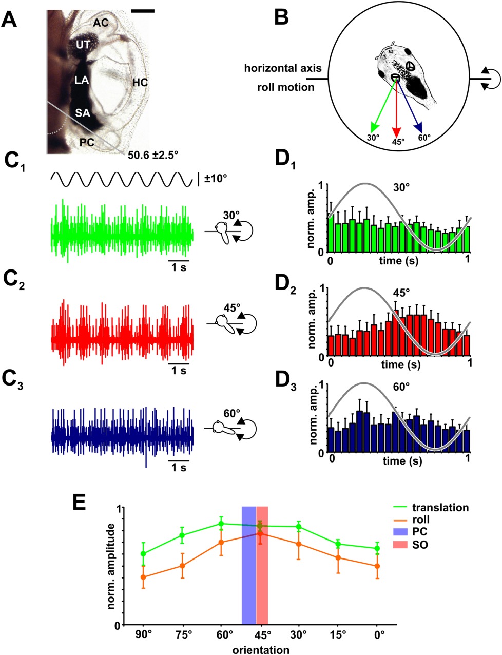 Figure 3 Aligned sensoryâmotor vector components of SO extraocular motor nerve responses during sinusoidal roll motion stimulation. (A) Photograph of the inner ear, illustrating the location and average orientation of the posterior semicircular canal (PC) relative to the body length axis (mean ±SEM; nâ=â12). (B) Systematic reorientation of the position of the preparation with respect to the plane of horizontal axis roll motion. (C) Multipleâunit activity of the left SO motor nerve during seven cycles of sinusoidal roll motion (1 Hz; ±10°) with the preparation oriented 30° (C1), 45° (C2), and 60° (C3) to the left (pictograms); upper trace indicates table position and lower traces the nerve discharge. (D) Averaged firing rates of the SO motor nerve discharge shown in C1â3 as PSTH (±SEM; nâ=â7 oscillations, respectively) for single cycles, respectively, along the three roll motion planes (C1â3); black sinusoid indicates table positional change (negative sine wave indicates forward motion). (E) Response modulation of SO motor nerve discharge during translational (green curve) and roll (red curve) motion in different planes relative to the body length axis (0°); data for the translational response modulation were obtained from animals at stage 53â55 of Group 3 (nâ=â6) shown in Figure 2; blue and red shaded areas represent the mean ±SEM of the posterior semicircular canal orientation and the pulling direction of the SO eyemuscle, respectively. Calibration bar in A represents 0.5 mm. AC, PC, HC, anterior vertical, posterior vertical, horizontal semicircular canal; LA, lagena; SA, saccule; UT, utricle.