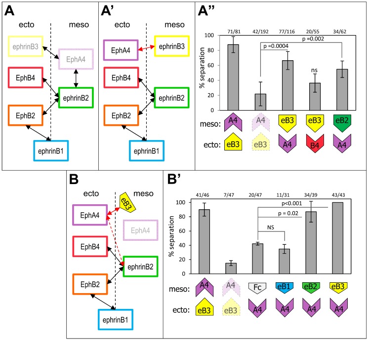 Figure 3. Ectodermâmesoderm separation relies on asymmetric expression of specific ephrin/Eph pairs across the boundary, irrespective of the direction of the asymmetry.(A, Aâ², Aâ²) Reciprocal replacement of mesodermal ephrinB3 and ectodermal EphA (mRNA injection). (A, Aâ²) Diagram describing the experiment. (A) Endogenous ephrinB3 and EphA4 were depleted in the mesoderm and ectoderm, respectively (ghost labels). (Aâ²) EphrinB3 (or B2) was then overexpressed in the ectoderm and EphA4 (or B4) in the mesoderm, thus effectively swapping the ligand and receptor (red double arrow). (Aâ²) Quantification. Swapping ephrinB3 and EphA4 efficiently restored separation. EphrinB3 could be replaced by ephrinB2, consistent with the latter also being a ligand for EphA4. However, EphA4 could not be substituted by EphB4, in agreement with EphA4 being the only receptor of ephrinB3. The weak nonsignificant rescue was likely due to a slight boost in the ephrinB2âEphB4 signal. (B, Bâ²) Similar experiment, but with the ephrin ligand substituted by direct incubation of the receiving explant with the corresponding soluble Fc fragment. EphrinB3 and EphA4 were depleted, EphA4 was overexpressed in the ectoderm, and ectoderm explants were incubated with the indicated Fc fragments. Overexpression of EphA4 led to a partial rescue of separation (control Fc), likely by activating ephrinB2âEphA4 signaling across the boundary (red dashed double arrow). Incubation with ephrinB3-Fc fully rescued separation. EphrinB2-Fc but not the ephrinB1-Fc fragment could also rescue, in agreement with the selectivity of EphA4. |
