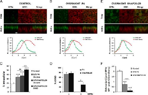 Fig. 2. GPRx-GFP membrane localization is important for its meiotic arrest activity. (A/B/E) Oocytes were injected with RNA coding for GPRx-GFP (10 ng/cell) and KDEL-mCherry (20 ng/cell). Confocal imaging was performed 48 h after injection, on untreated oocytes (A), oocytes treated with P4 overnight (B) or oocytes injected with SNAP25δ20 RNA (20 ng/oocyte) and allowed to express overnight (E). Upper panels, representative images from a deep cytoplasmic focal plane and orthogonal sections are shown. The scale bar is 2 μm. Lower panels, representative fluorescent intensity profile for GPRx-GFP and KDEL-Cherry across a z-stack of images. C) The effect of overnight progesterone (P4) or SNAP25δ20 expression on GPRx-GFP distribution. The histogram shows the percentage of intracellular GPRx-GFP in untreated control cells (Control, 61 oocytes from 8 donor females); cells exposed to P4 overnight (O/N P4, 13 oocytes from 3 donor females) or cells injected with SNAP25δ20 RNA and allowed to express overnight (O/N SNAP25δ20, 31 oocytes from 3 donor females and 12 GVBD from 2 donor females). D) Percentage of oocytes reaching the GVBD stage following progesterone treatment or overnight SNAP25δ20 expression (20 ng RNA/oocyte) in control cells and cells expressing GPRx-GFP (10 ng RNA/oocyte). F) The distance (μm) between the GPRx-GFP fluorescence peak and KDEL-mCherry peak is shown before (24 oocytes from 8 donor females), after overnight P4 (13 oocytes from 3 donor females), and after expression of SNAP25δ20 (12 cells from 2 donor females). All data are shown as means±s.e.m., âp<0.05, ââp<0.001, âââp<0.0001 when compared to control or as indicated by the bar.