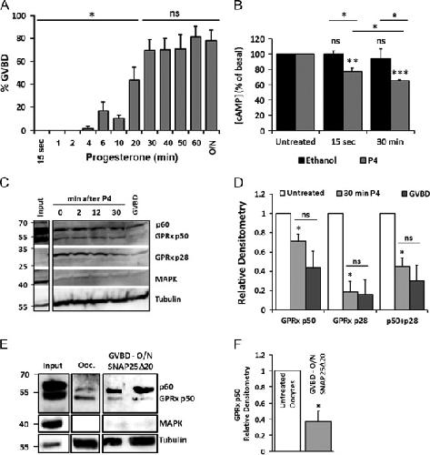Fig. 3. Endogenous GPRx internalizes in response to progesterone treatment. A) Percentage of oocytes reaching the GVBD stage following different exposure times to P4 ranging from 15 s to overnight (O/N). Data from 6 donor females. B) cAMP levels in oocytes untreated oocytes and oocytes exposed to either P4 or the carrier control ethanol for 15 s or 30 min. Data are normalized to untreated oocytes C-E) Oocytes were treated with P4 for 0, 2, 12, 30 min and overnight (C); or overnight with SNAP25δ20 (E). Membrane proteins were biotinylated and purified as described in materials and methods. Whole lysates (2 oocytes) and biotinylated membrane proteins were examined by western blotting for the indicated antigens. D-F) Densitometry analyses on Western blots as in panel C and E. GPRx-p28 and/or p50 band intensity was normalized to tubulin. Data are normalized to untreated oocytes. All data are shown as means±s.e.m., âp<0.05, ââp<0.001, âââp<0.0001, ns, not significant, when compared to control or as indicated by the bar.