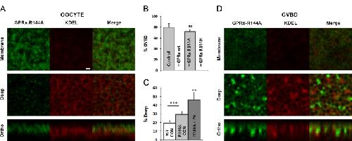 Fig. 4. Function and distribution of an inactive GPRx mutant, GPRx-R144A. A and D) Oocytes were injected with GPRx-R144A-GFP (10 ng RNA/cell) and KDEL-mCherry (20 ng RNA/cell) and imaged 48 h later. Representative images from the membrane plane, deep cytoplasmic focal plane and orthogonal sections through the entire z-stack of images are shown for an untreated oocyte (A) and a P4-treated oocyte that has matured past the GVBD stage (D). The scale bar is 2 μm. B) Rates of oocyte maturation in response to an overnight P4 incubation in control untreated oocytes (50 oocytes); and oocytes injected with RNA coding for GPRx-wt (60 oocytes), GPRx-R144A (67 oocytes) or GPRx-R144H (60 oocytes) (10 ng RNA/oocyte). Data are from 4 donor females. C) Percentage of intracellular GPRx-GFP (WT; 61 cells), GPRx-R144A-GFP before (R144A CON; 15 oocytes) and after P4treatment resulting in oocyte maturation (R144A+P4; 11 cells). All data are shown as means±s.e.m., âp<0.05, ââp<0.001, âââp<0.0001, ns, not significant, when compared to control or as indicated by the bar.
