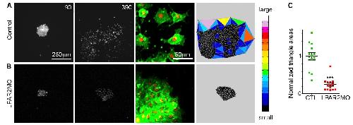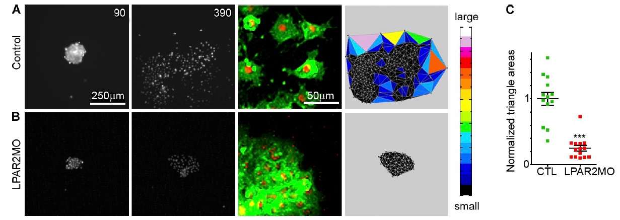 Figure S3. Cell dispersion assay with control and LPAR2MO-injected cells. (A) Control cells. (B) LPAR2MO cells. (C) Normalized mean triangle areas between the nearest neighbors. n = 27 explants from three independent experiments. Student’s two-tailed t test: ***, P < 0.005. Error bars indicate SD. |