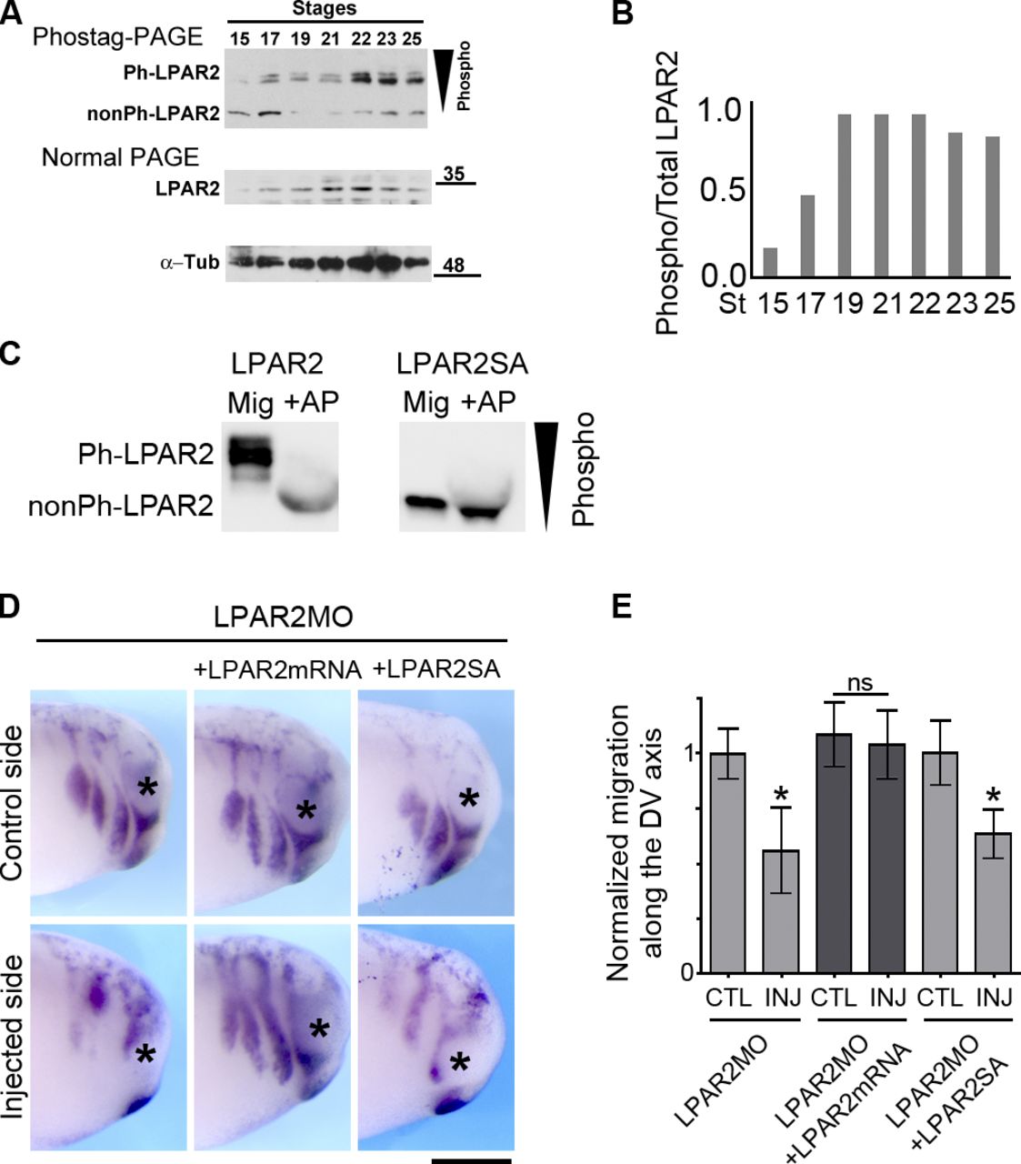 Figure 2. LPAR2 phosphorylation is required for in vivo NC migration. (A) Western blot of whole LPAR2 with Phos-tag PAGE showing that the phosphorylated forms of LPAR2 (Ph-LPAR2) become predominant at the onset of NC migration (stage 19). nonPh-LPAR2, nonphosphorylated LPAR2; α-Tub, α-Tubulin. (B) Normalized ratio of PhoshoLPAR2 and Phospho+nonphosphoLPAR2. The experiment was done four times. A representative gel and a representative graph showing the ratio of Phospho-LPAR2/Total LPAR2 are depicted in A and B, respectively. (C) Western blot of control (LPAR2) or point mutation S324A LPAR2 (LPAR2SA) cytoplasmic tail with Phos-tag PAGE. Alkaline phosphatase (+AP) treatment allows visualization of the non-phosphorylated bands. (D) Embryos injected with LPAR2MO or coinjected with LPAR2MO and 5 mismatch (5 mm) LPAR2 mRNA or 5 mmLPAR2SA mRNA. A mixture of FoxD3 and Dlx2 probes (which labels premigratory as well as migratory NC cells) was used to visualize the whole NC population. Asterisks indicate eyes. (E) Quantification of NC migration from embryos shown in D (18 embryos were analyzed). One-way ANOVA, P = 0.0025. Individual comparisons: *, P < 0.05. Error bars indicate SD. |