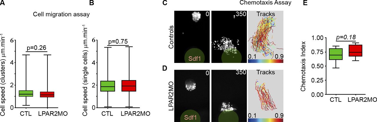 Figure 3. Inhibition of LPAR2 does not affect cell motility or chemotaxis. (A and B) Cell tracking analysis on cell clusters (A; n = 2,261 cells from four independent experiments; Studentâs two-tailed t test: P = 0.25) and single cells (B; n = 1,299 cells from three independent experiments; Studentâs two-tailed t test: P = 0.75). (C and D) Chemotaxis assay with controls (C) and LPAR2MO cells (D). Time projection of cell tracks color-coded according to their Chemotaxis index (from blue [0.1] to red [0.9]). (E) Chemotaxis index from experiments shown in C and D (mean chemotactic index of 22 explants from three independent experiments; Studentâs two-tailed t test: P = 0.1837). |