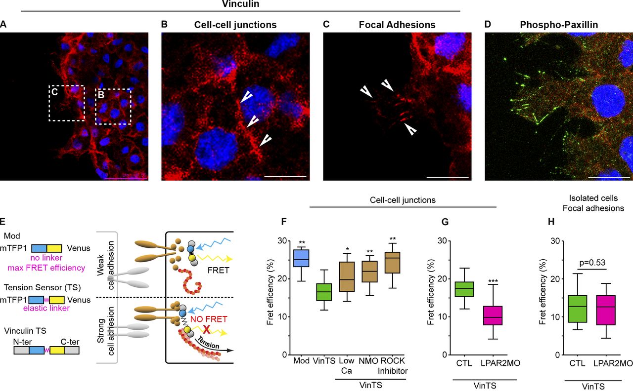 Figure 6. Lack of LPAR2 signaling generates increased tension at cellâcell junctions. (AâC) Vinculin immunostaining in Xenopus NC cells. Vinculin localizes at cellâcell junctions (arrowheads in B) and at focal adhesions (arrowheads in C). (D) Immunostaining against Phospho-Paxillin. Nuclei are stained with DAPI (blue). Bars: (A) 50 µm; (BâD) 15 µm. (E) Diagram depicting how the VinTS FRET probe works. (F) Vinculin FRET at the cellâcell contacts with control FRET probe (Mod, blue) and VinTS in controls (green) or low cellâcell adhesion conditions (brown). n = 76 cells from three independent experiments. One-way ANOVA: P < 0.001. Individual comparison: *, P < 0.05; **, P < 0.01. (G) Vinculin FRET at the cellâcell contacts in controls (green) and LPAR2MO cells (magenta). n = 64 cells from three independent experiments. Studentâs two-tailed t test: P < 0.001. (H) Vinculin FRET in focal adhesions in controls (green) and LPAR2MO cells (magenta). n = 22 cells from three independent experiments. Studentâs two-tailed t test: P = 0.53. |