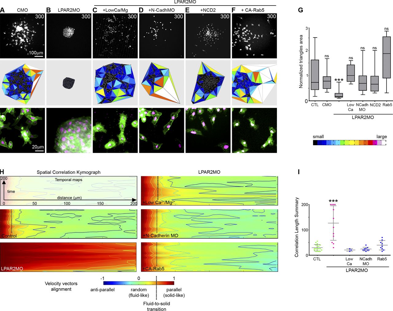 Figure 7. Inhibition of cellâcell adhesion rescues LPAR2 loss of function. (AâF) Cell dispersion assay in controls (A), LPAR2MO cells (B), or LPAR2MO cells in low calcium/magnesium conditions (C), coinjected with N-Cadherin MO (D), incubated with N-Cadherin blocking antibody (E), or coinjected with activated Rab5 (F). (G) Dispersion analysis using Delaunay triangulation from experiments shown in A. n = 103 explants from 12 independent experiments. One-way ANOVA: P < 0.0001. Individual comparison: ***, P < 0.001; ns, not significant. (H) Spatial correlation analysis. The broken line represents the solid-to-fluid transition. (I) Quantification of the spatial correlation analysis; the plot shows distances at which the alignment of velocity vectors falls below 0.5 for each experimental condition. n = 17 explants from three independent experiments. One-way ANOVA: P < 0.0001. Individual comparisons: ***, P < 0.01. |