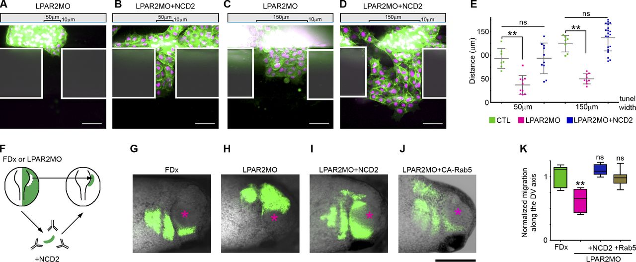Figure 8. Inhibition of N-cadherin restores migration of LPAR2 morphant cells through interstices in vitro and in vivo. (AâD) Invasion assay with LPAR2MO cells (A and C) or LPAR2MO cells incubated with N-cadherin blocking antibody (NCD2; B and D). (E) Quantification of the invasion assay shown in AâD. 50 µm, n = 27 explants from four independent experiments. One-way ANOVA: P < 0.0001. 150 µm, n = 36 explants from four independent experiments. One-way ANOVA: P < 0.0001. Individual comparisons: ***, P < 0.001. Error bars indicate SD. (F) Grafting procedure. (GâJ) Grafts of NC injected with FDx (G), FDx and LPAR2MO directly into control hosts (H), FDx and LPAR2MO treated with N-cadherin antibody (NCD2) before transplantation (I), or LPAR2MO cells overexpressing CA-RAb5 (J). Asterisks indicate eyes. (K) Analysis of NC migration of the experiment shown in GâJ. 35 embryos were analyzed. One-way ANOVA: P < 0.0001. Individual comparisons: **, P < 0.01; ns, not significant. Bars: (AâD) 50 µm; (GâJ) 0.5 mm. |