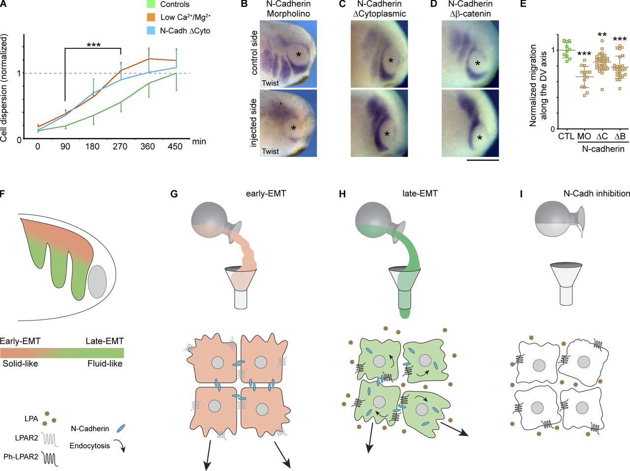 Figure 9. In vivo CCM requires a basal level of cellâcell adhesion. (A) Dispersion assay of controls (green curve) or control cells cultured in low calcium/magnesium conditions (orange curve), or cells expressing N-cadherin dominant-negative (N-cadh δCyto, blue curve) analyzed by triangulation. Control versus low Ca2+/Mg2+, n = 11 explants from four independent experiments. Studentâs two-tailed t test: ***, P = 0.0093. Control versus N-CadhδCyto, n = 15 explants from four independent experiments. ***, P = 0.0094. Error bars indicate SD. (BâD) Analysis of NC migration after inhibition of N-cadherin using a Morpholino (B), overexpression of deletion constructs lacking the cytoplasmic domain (C), and a β-catenin binding domain (D). Asterisks indicate eyes. (E) Distance of NC migration from experiments shown in BâD. 77 embryos were analyzed. One-way ANOVA: P < 0.0001. Individual comparisons: **, P < 0.01; ***, P < 0.001. Error bars indicate SD. (FâI) Model of NC migration. (F) NC cells progressively dissociate while migrating toward the ventral side of the head. The color code indicates the range of partial mesenchymal phenotypes with a transition from an early EMT/solid-like (red) to a late-EMT/fluid-like (green) phenotype. (G) At the onset of EMT, cells are motile but too tightly attached to one another to invade other tissues, as they express high levels of N-cadherin in the membrane. (H) After cellâcell dissociation triggered by LPA/LPAR2âdependent N-cadherin internalization, NC cells can migrate and invade other tissues. (I) Dramatic reduction of cellâcell adhesion promotes a fully mesenchymal phenotype that favors dispersion of individual cells in vitro but impairs directional migration in vivo. |