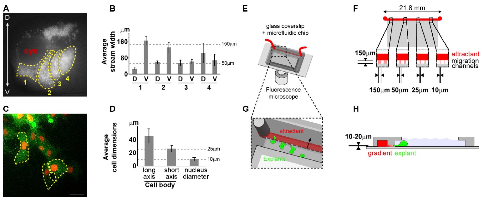 Figure S2. Using a microfluidic chamber to test 2D migration under physical constraints. (A) In vivo NC migration. The broken lines outline NC streams. Bar, 150 μm. (B) Minimum and maximum width of the four NC streams in vivo. (C) In vitro NC migration. The broken lines outline NC cells. Bar, 25 μm. (D) Mean width of the cellâs long and short axis and mean nucleus diameter. (EâH) PDMS microfluidic chamber contains tunnels 10, 25, 50, and 150 μm wide by 120 μm long and îº10â20 μm high mounted on a glass coverslip. The dish is coated with Fibronectin and the tunnels separate a closed compartment that is filled with Stromal cellâderived factor 1 (red) and an open compartment where explants are seeded in front of the tunnels. |