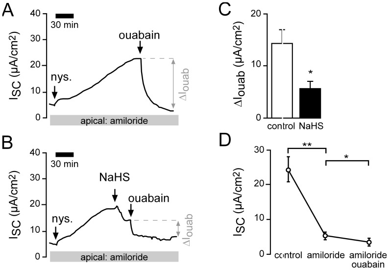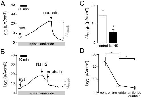 Figure 4. H2S decreases Na+/K+-ATPase currents of Xenopus lung epithelia.A) Representative current trace of a control recording. The apical membrane of the lung epithelium was permeabilized with nystatin (100 µM, apical) in the presence of amiloride (10 µM). This resulted in a current increase. When the current was stable, the Na+/K+-ATPase inhibitor ouabain (1 mM) was applied to the basolateral side. The ouabain-sensitive current fraction (ΔIouab) represents the activity of the Na+/K+-ATPase. B) After permeabilisation with nystatin, NaHS (1 mM) was applied to the apical bath. ISC decreased significantly from 20.83±3.99 µA/cm2 to 16.17±5.23 µA/cm2 (n = 6, N = 6, p≤0.05). Subsequently, ouabain-sensitive current fractions were determined. C) Statistical evaluation of experiments as shown in panels A and B. NaHS significantly inhibited Na+/K+-ATPase activity (ΔIouab; n = 6, N = 6, p≤0.05). D) Without permeabilisation with nystatin, ouabain had only a minor effect on transepithelial ion current in the presence of amiloride. Depicted are mean values of non-permeabilized lung epithelia which have been treated with amiloride (10 µM, apical) followed by ouabain (1 mM, basolateral).