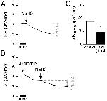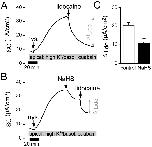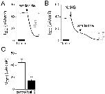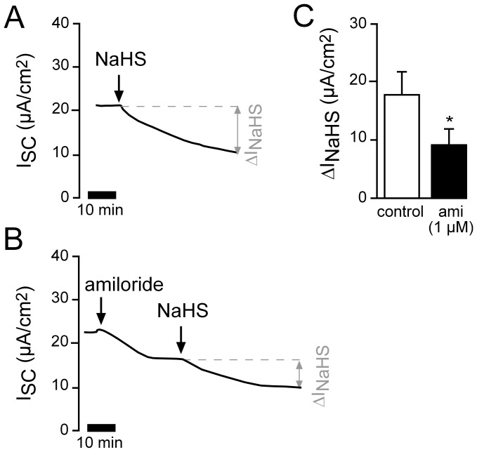 Figure 3. Amiloride attenuates the H2S induced current decrease.A) Representative current trace of a control experiment showing the effect of apical treatment with NaHS (1 mM). B) Lungs were treated with 1 µM amiloride apically and NaHS (1 mM) was subsequently applied for the same duration as the parallel conducted control experiment as depicted in panel A. C) Statistical evaluation. Amiloride significantly reduced the NaHS-mediated current decrease (ΔINaHS; n = 6, N = 6, p≤0.05).