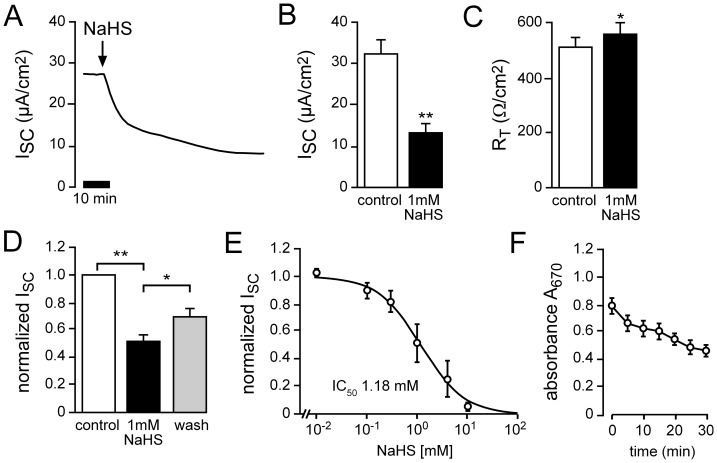 A) Representative current trace of an Ussing chamber recording. The application of NaHS (1 mM) to the apical compartment of the chamber led to a strong decrease in transepithelial ion current (ISC). B) Statistical analysis of experiments as shown in panel A. NaHS significantly reduced ISC by approx. 60% (nâ=â19, Nâ=â13, pâ¤0.01). C) Following application of NaHS, transepithelial resistance (RT) increased significantly (nâ=â19, Nâ=â13, pâ¤0.05). D) The effect of NaHS was partially reversible. Depicted are values of ISC which were normalized to baseline values before application of NaHS. After wash-out of NaHS, there was a significant increase in current (nâ=â8, Nâ=â5, pâ¤0.05). E) NaHS dose-dependently decreased ISC (nâ=â2â3, Nâ=â3). Data were obtained from Ussing chamber recordings in which cumulative doses of NaHS were applied. Total values of ISC were fitted according to the Hill equation. F) Evaporative loss of H2S during experiments. NaHS (1 mM) was applied to NRS and aliquots were taken every 5 min. H2S was indirectly measured by the formation of methylene blue and its absorption at 670 nm (nâ=â3).
