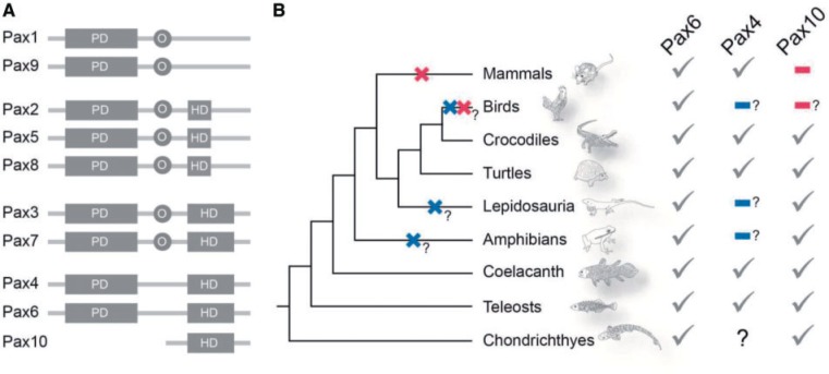 The members of the paired box (Pax) family regulate key developmental pathways in many metazoans as tissue-specific transcription factors. Vertebrate genomes typically possess nine Pax genes (Pax1-9), which are derived from four proto-Pax genes in the vertebrate ancestor that were later expanded through the so-called two-round (2R) whole-genome duplication. A recent study proposed that pax6a genes of a subset of teleost fishes (namely, acanthopterygians) are remnants of a paralog generated in the 2R genome duplication, to be renamed pax6.3, and reported one more group of vertebrate Pax genes (Pax6.2), most closely related to the Pax4/6 class. We propose to designate this new member Pax10 instead and reconstruct the evolutionary history of the Pax4/6/10 class with solid phylogenetic evidence. Our synteny analysis showed that Pax4, -6, and -10 originated in the 2R genome duplications early in vertebrate evolution. The phylogenetic analyses of relationships between teleost pax6a and other Pax4, -6, and -10 genes, however, do not support the proposed hypothesis of an ancient origin of the acanthopterygian pax6a genes in the 2R genome duplication. Instead, we confirmed the traditional scenario that the acanthopterygian pax6a is derived from the more recent teleost-specific genome duplication. Notably, Pax6 is present in all vertebrates surveyed to date, whereas Pax4 and -10 were lost multiple times in independent vertebrate lineages, likely because of their restricted expression patterns: Among Pax6-positive domains, Pax10 has retained expression in the adult retina alone, which we documented through in situ hybridization and quantitative reverse transcription polymerase chain reaction experiments on zebrafish, Xenopus, and anole lizard.