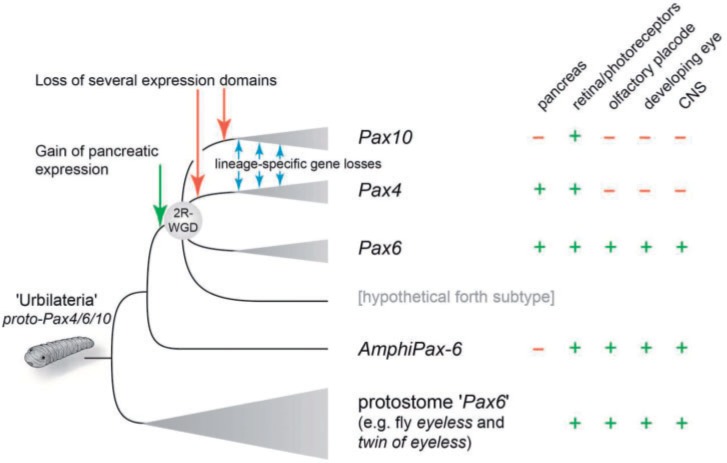 Ravi, Sequencing of Pax6 loci from the elephant shark reveals a family of Pax6 genes in vertebrate genomes, forged by ancient duplications and divergences. 2013, Pubmed