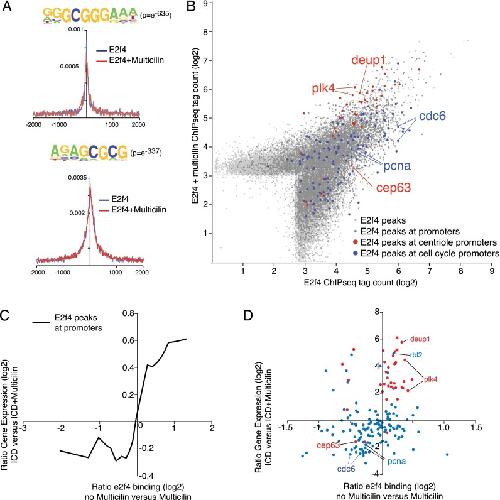 Multiciliate cells employ hundreds of motile cilia to produce fluid flow, which they nucleate and extend by first assembling hundreds of centrioles. In most cells, entry into the cell cycle allows centrioles to undergo a single round of duplication, but in differentiating multiciliate cells, massive centriole assembly occurs in G0 by a process initiated by a small coiled-coil protein, Multicilin. Here we show that Multicilin acts by forming a ternary complex with E2f4 or E2f5 and Dp1 that binds and activates most of the genes required for centriole biogenesis, while other cell cycle genes remain off. This complex also promotes the deuterosome pathway of centriole biogenesis by activating the expression of deup1 but not its paralog, cep63. Finally, we show that this complex is disabled by mutations in human Multicilin that cause a severe congenital mucociliary clearance disorder due to reduced generation of multiple cilia. By coopting the E2f regulation of cell cycle genes, Multicilin drives massive centriole assembly in epithelial progenitors in a manner required for multiciliate cell differentiation.